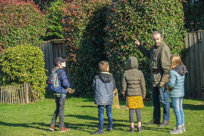 Buiten in de tuin wordt een demonstratie gegeven met roofvogels